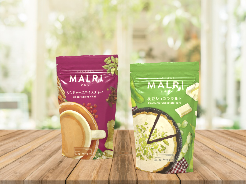 秋田県産のもち米や枝豆を主原料とした、直径2センチほどの一口サイズの洋風あられ「MARLIマルリ」のロゴデザインとパッケージデザインを担当。